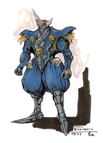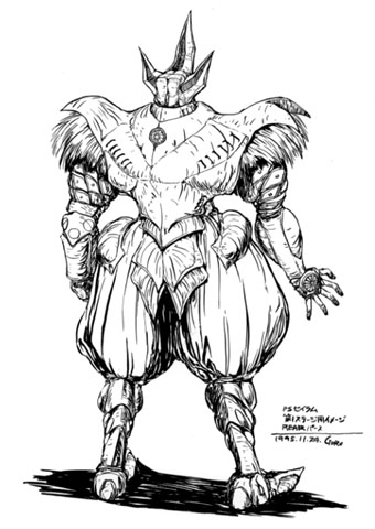 この仕事に参加して一番最初に描いたゼイラム 参加して驚いたことに、まだ、ゲームシステムすら出来て無く、横スクロールの アクションゲームでボス面が対戦格闘である、というコンセプトだけがかろうじて 存在しているだけでした。しかも近くに雨宮監督のチェックがあると言う話でしたので 実際のシナリオ等が上がったときには、最悪書き直し覚悟で とりあえずこれと、 次のゼイラムBの2点を描いたのですが、そういった物ができあがるまでさらに3ヶ月ほど 時間が必要だったようです。 このゼイラムコンセプトは、裃を着たゼイラム。 |